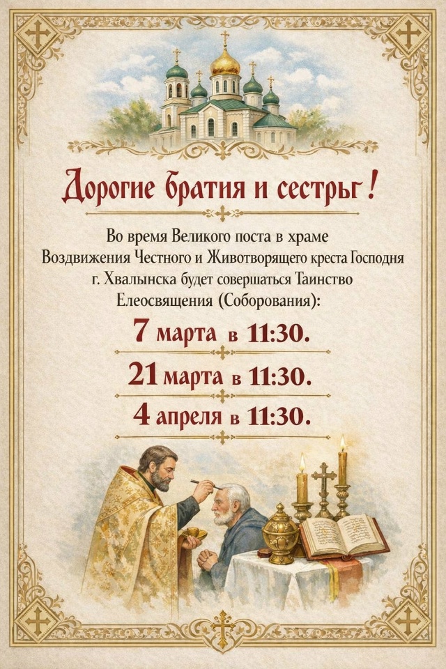 1 марта, в Неделю 1-ю Великого поста, Торжества Православия, в храме Воздвижения Честного и Животворящего Креста Господня г. Хвалынска состоялась Божественная литургия свт. Василия Великого. Её совершил настоятель храма протоиерей Павел Усов в сослужении клирика храма иерея Романа Архипова. Накануне было отслужено Всенощное бдение.